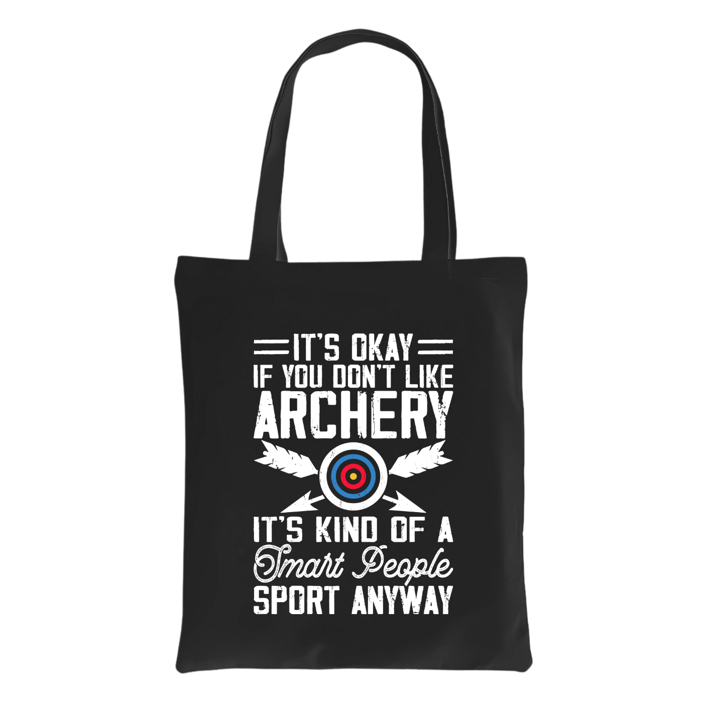 Say it how it is with this witty Smart People Sport Archery Tote bag from Thazzle. Featuring bold distressed text and a centre-target graphic, this black cotton bag delivers confidence and comedy in one perfectly practical package.